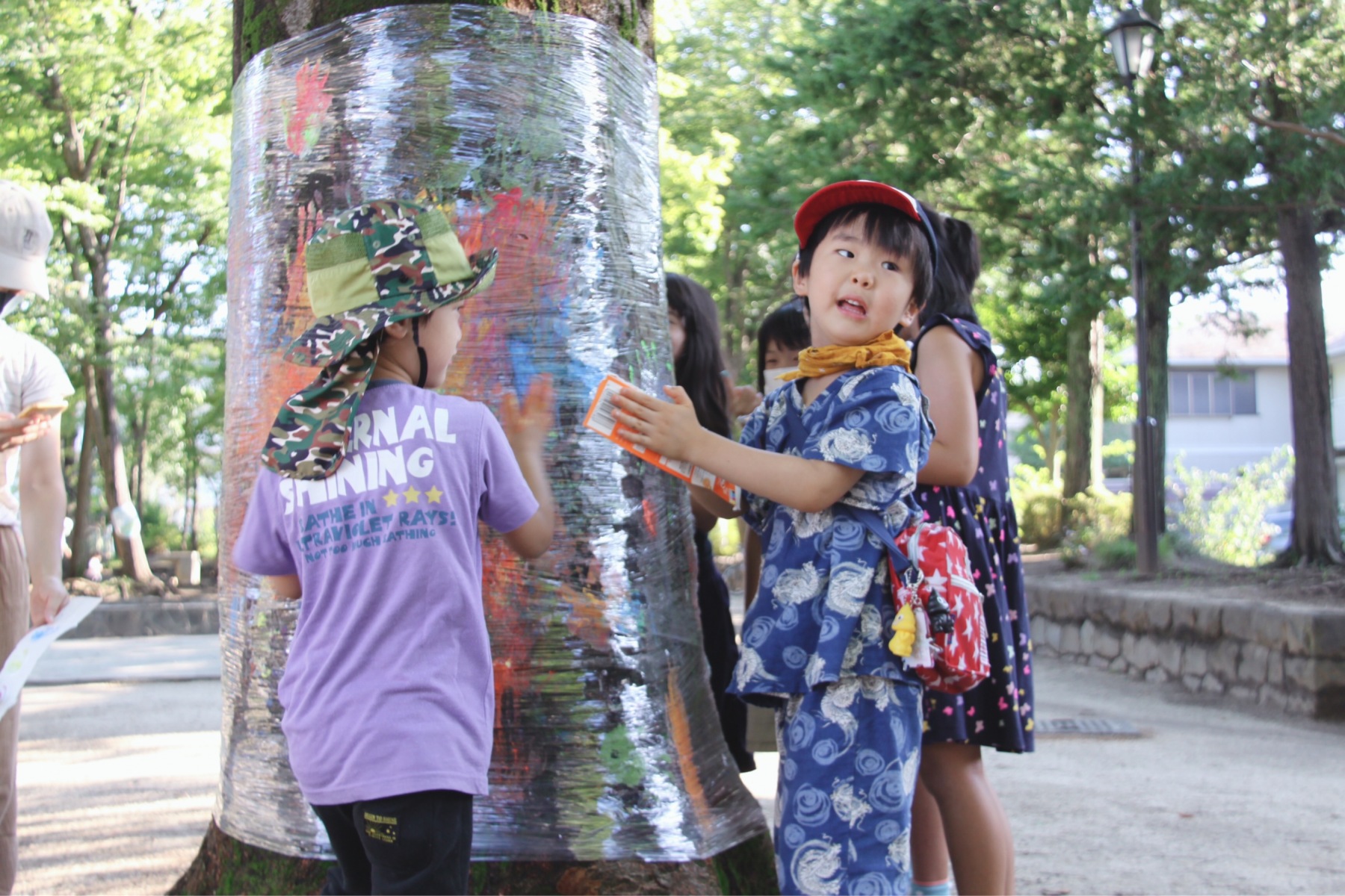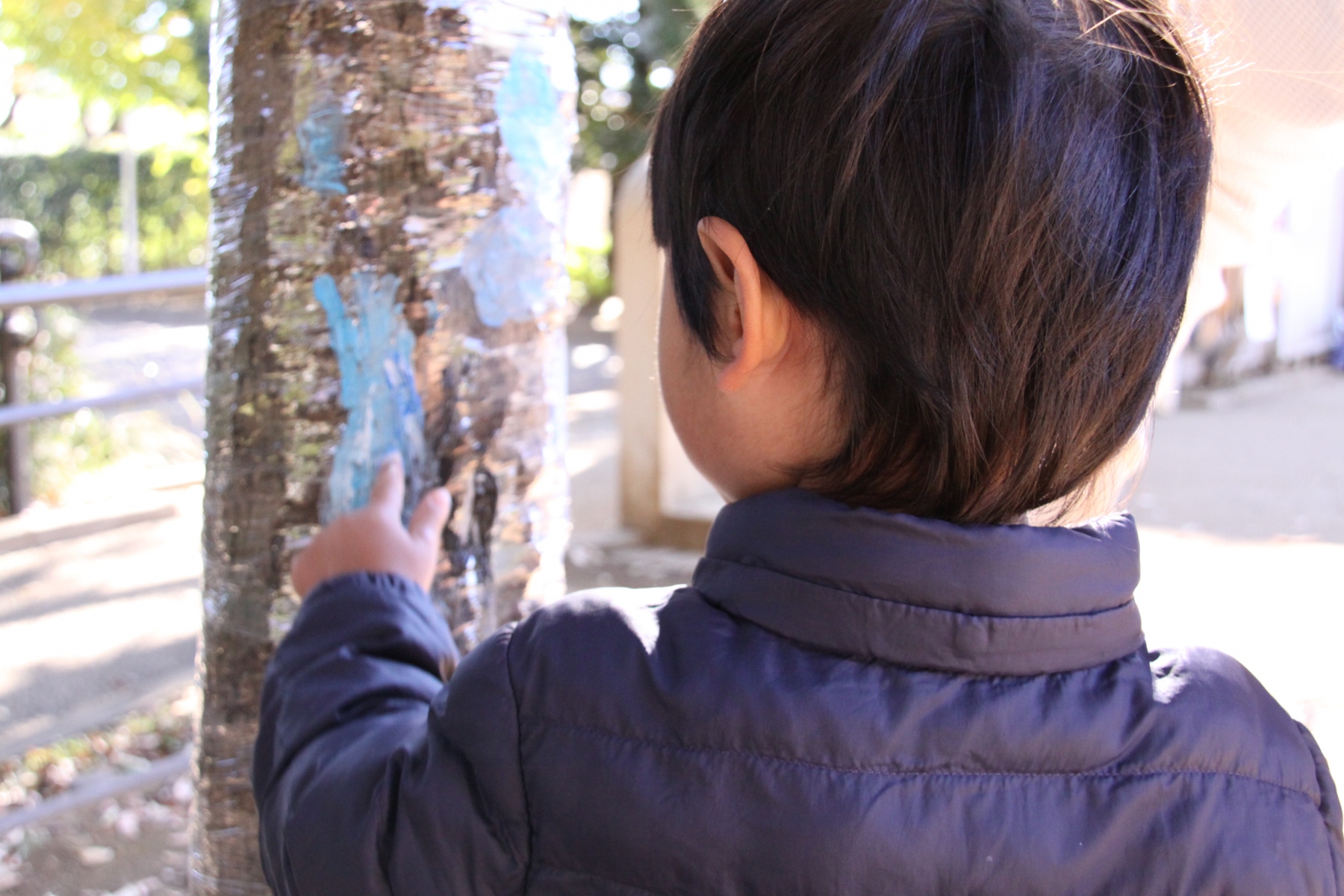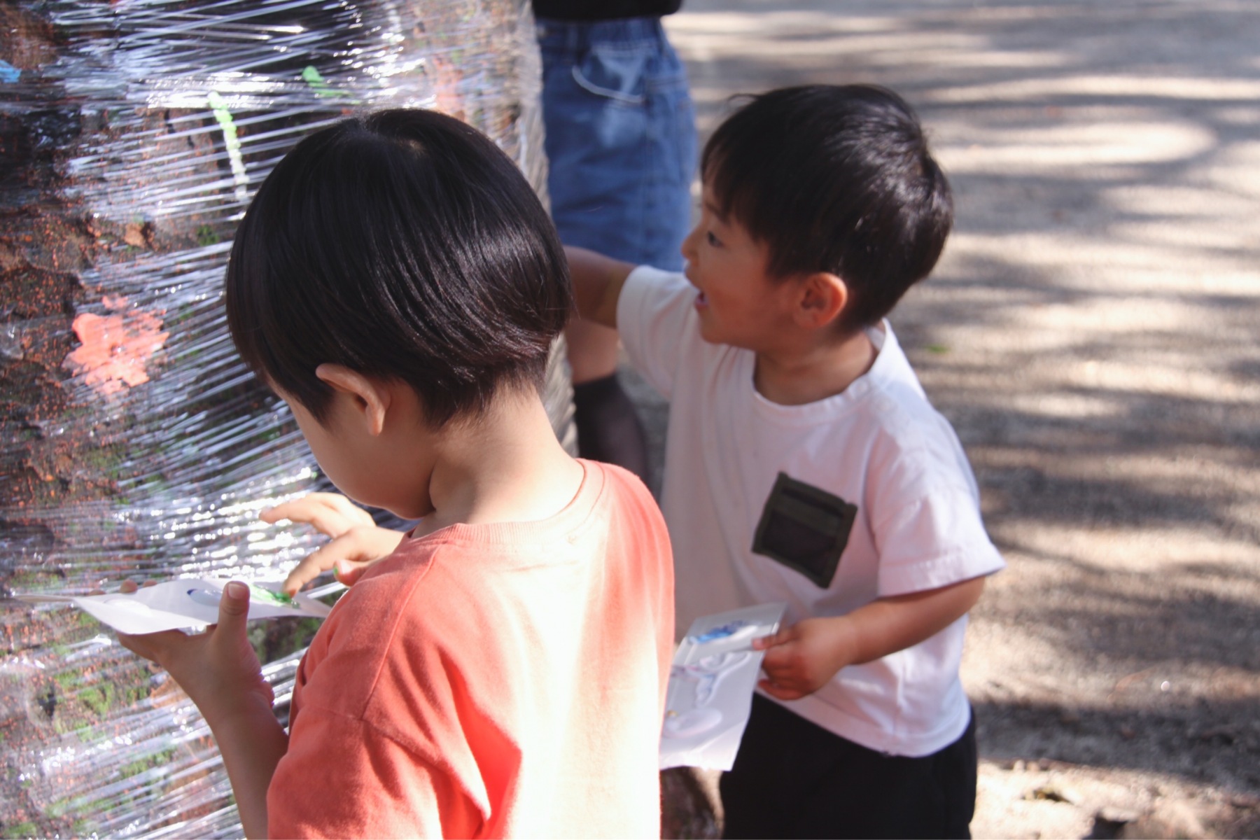 木の幹にラップを巻いて、ボンドと混ぜ合わせた絵の具でフィンガーペイントをします。