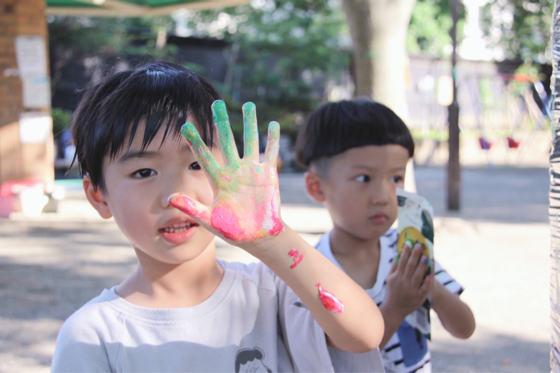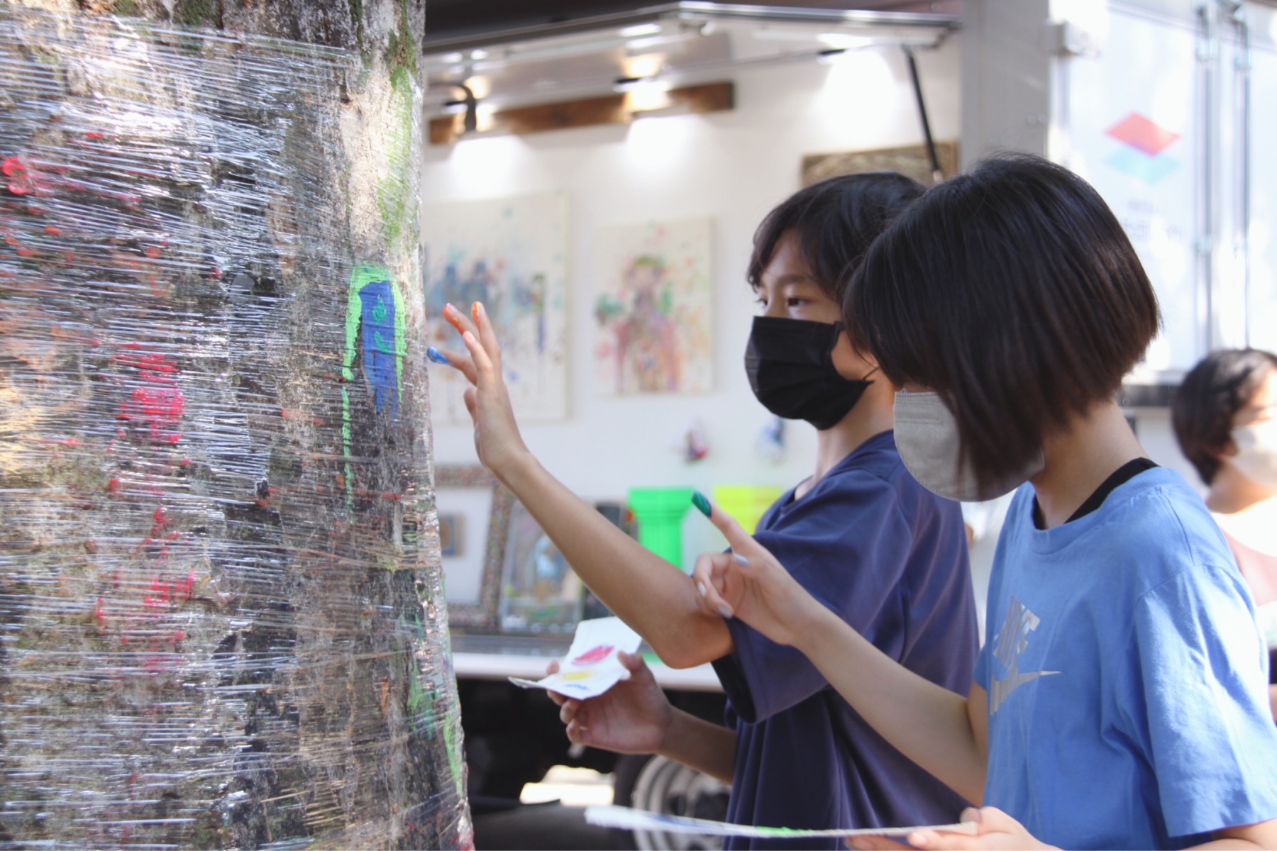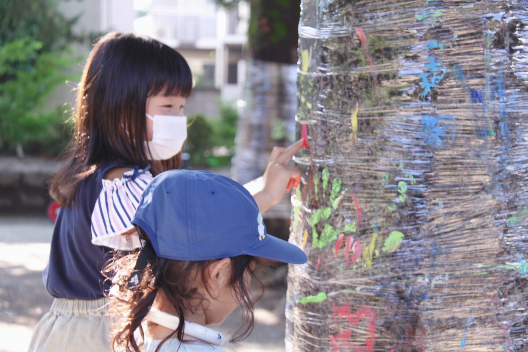 木の幹にラップを巻いて、ボンドと混ぜ合わせた絵の具でフィンガーペイントをします。