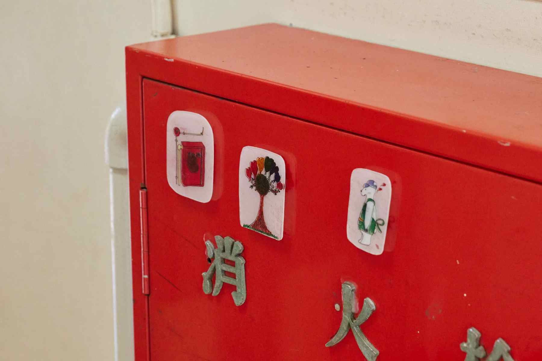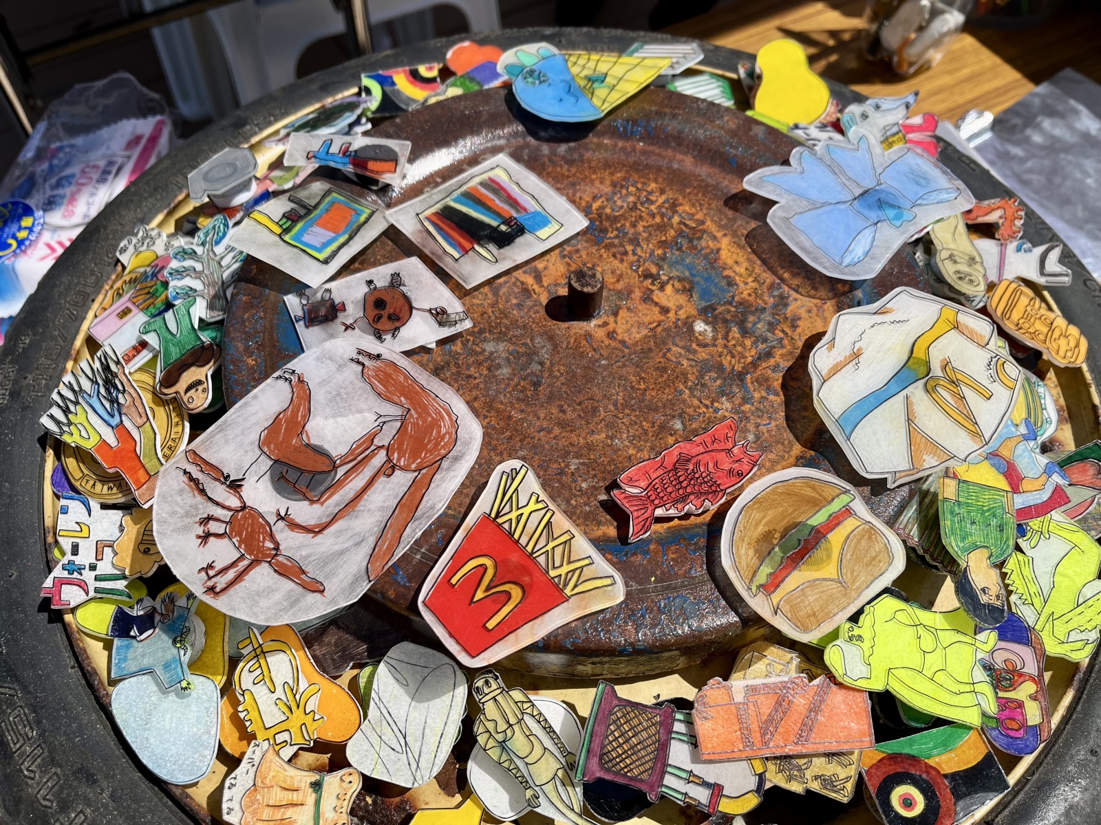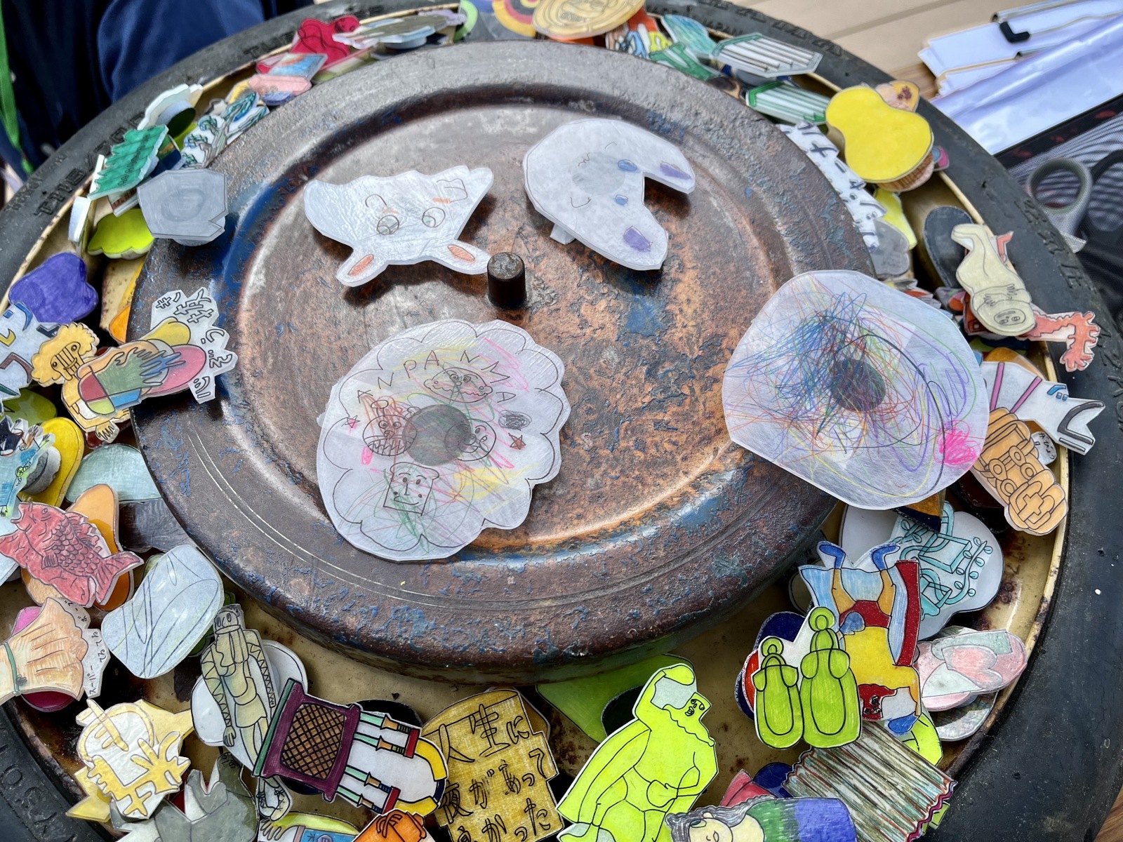 ワークショップではイベントテーマに合わせてプラ板マグネットを制作し、堀江が作品でも使用する廃材などの支持体や、会場となる場所の建具や家具などに貼りつけて楽しみます。