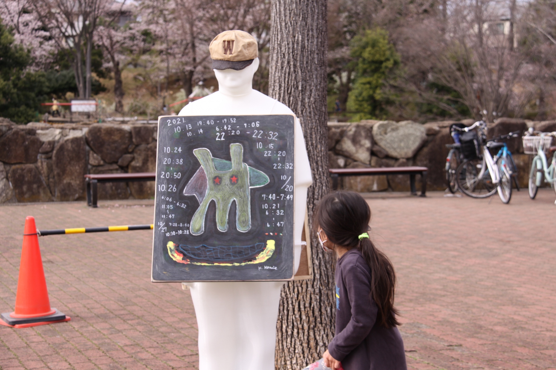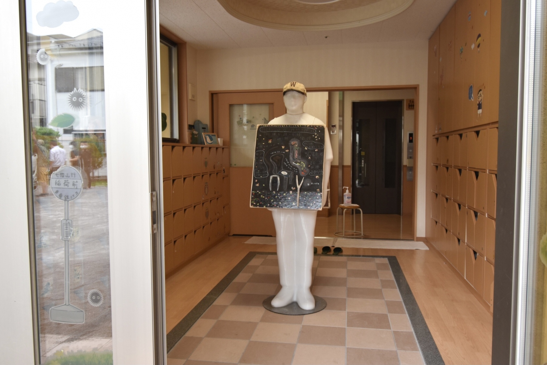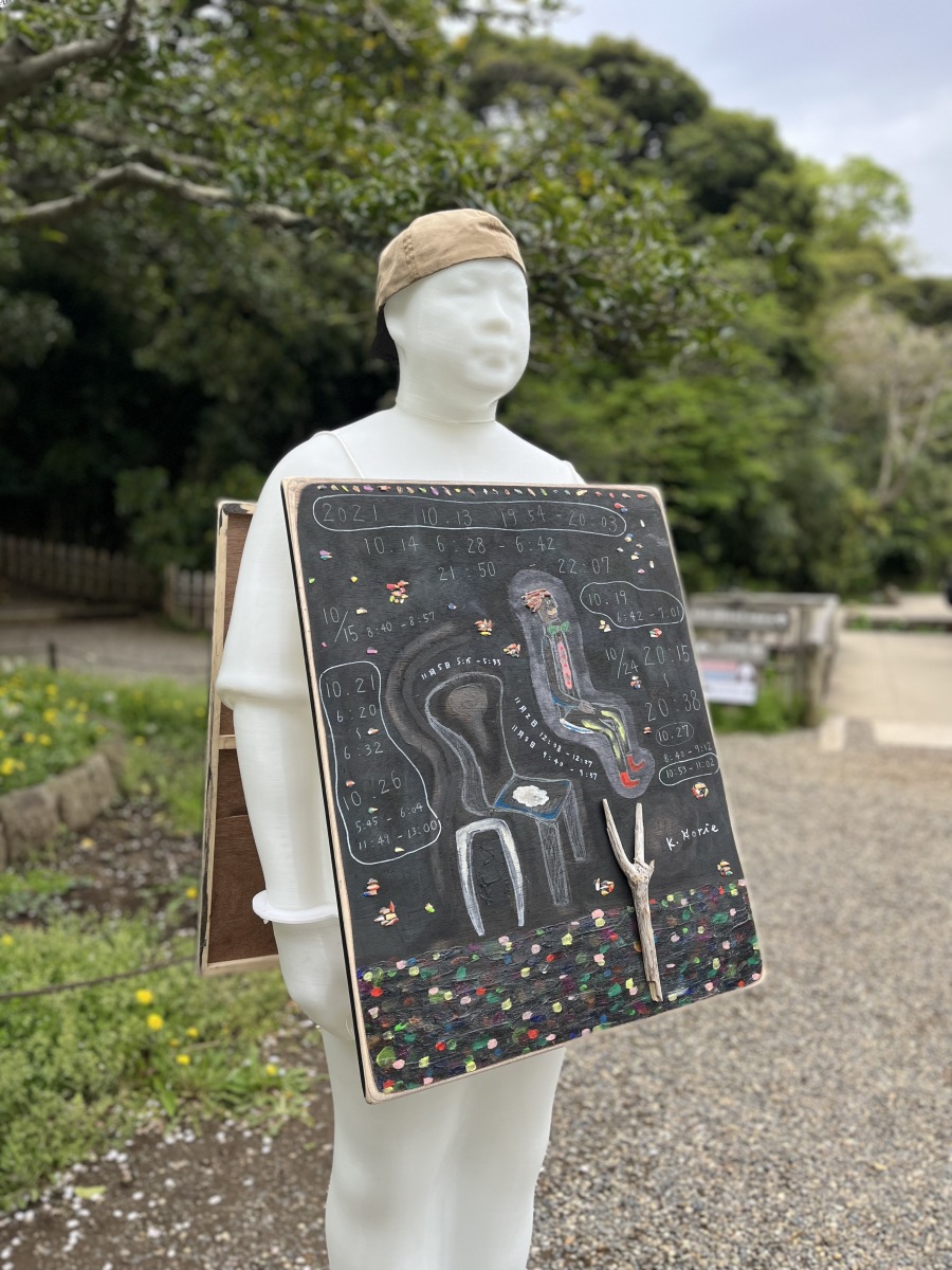 また人体型の造形物は、作家と作品の結びつきを想起させる装置としてのみ機能するのでなく、作家と作品とその受容者(鑑賞者)との関係にも言及しているようです。サンドイッチマンと呼ばれる、宣伝用の看板を取り付けられた人間広告塔を模した佇まいは、絵画の持つ「額装され壁に掛けられることで立派に見える」という身も蓋もない権威性を無化し、作品受容とコマーシャリズム、労働者としての作家像、アートの産業構造についての思考を誘うフックにもなっています。